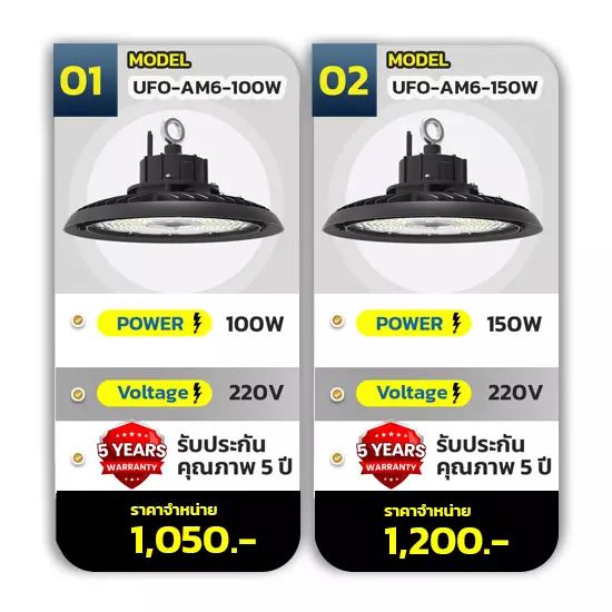 - โคมไฟ LED UFO 150W ให้ความสว่าง 22,500-30,000 ลูเมน